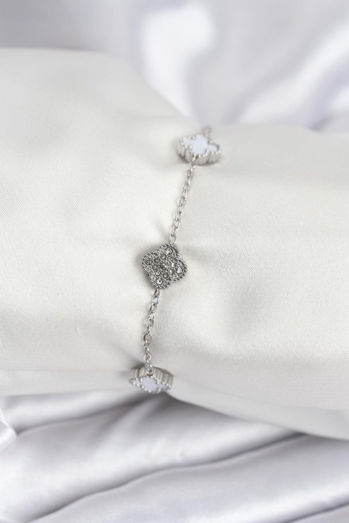 316L Çelik Gümüş Renk Beyaz ve Zirkon Taşlı Baby Boy Yonca Kadın Bileklik (BB7956)