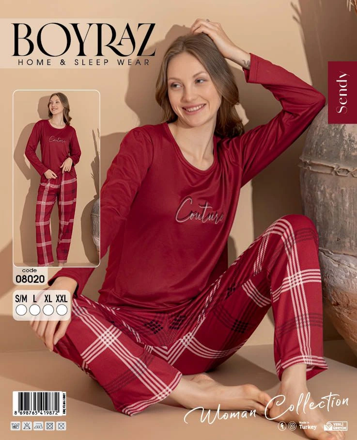 Boyraz 08020 Kadın Sendy Kumaş Uzun Kol Pijama Takımı (Boyraz.08020__BORDO)