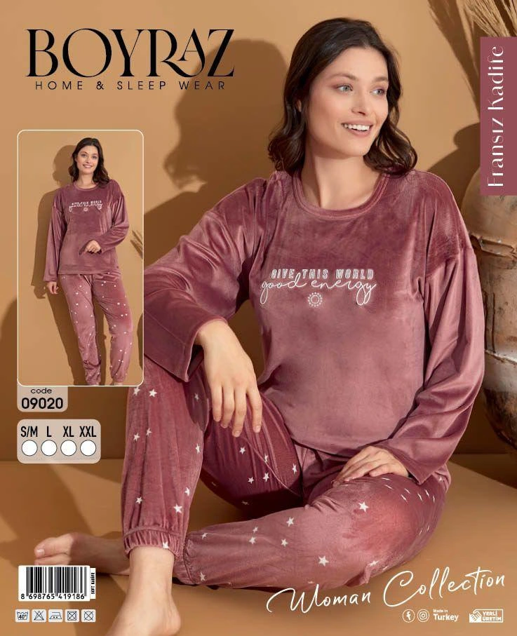 Boyraz 09020 Fransız Kadife Kumaş Uzun Kol Pijama Takımı (Boyraz.09020__GÜL KURUSU)