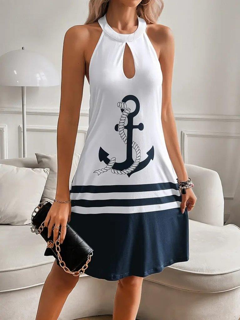Kadın Askılı çıpa Baskılı Sırtı Açık Kısa Süprem Elbise