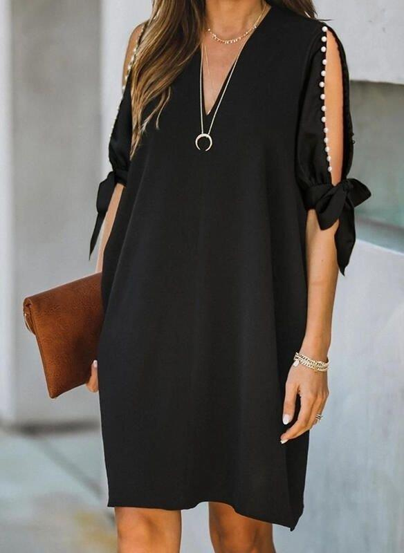 Kadın Kısa Kollu Inci şerit Detay Kol Pencereli Sandy Kumaş Elbise
