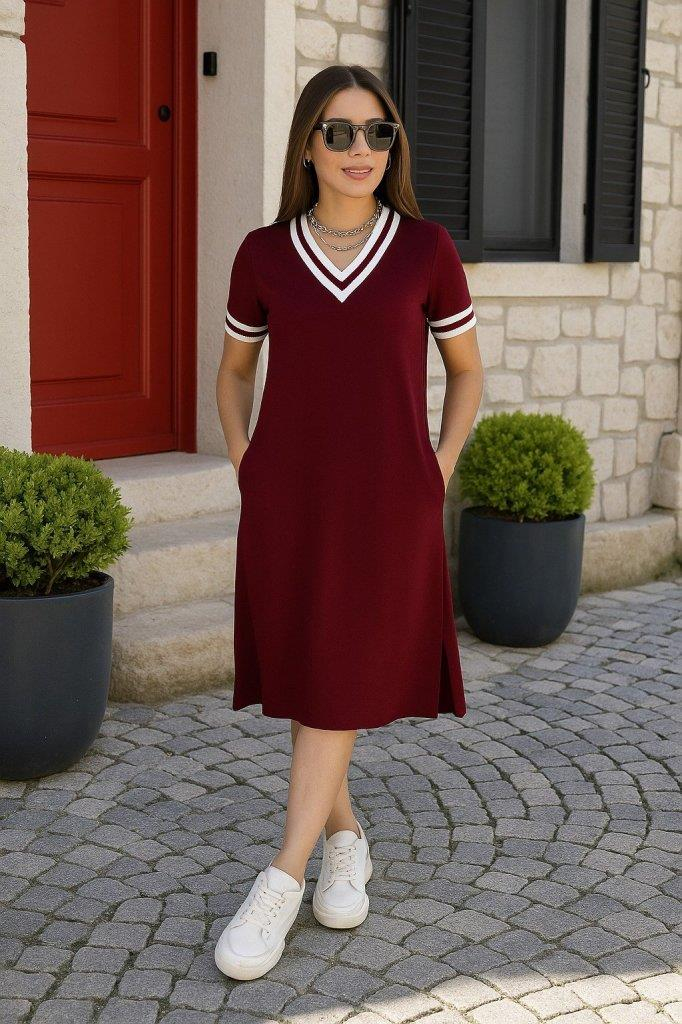 Kadın Kısa Kollu V Yaka Ve Yaka Ribana Detay Midiboy Viskon Elbise