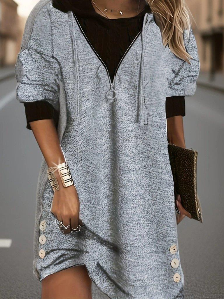 Kadın Uzun Kollu Kapşonlu önden Fermuarlı Düğmeli Mini Iki Iplik Elbise