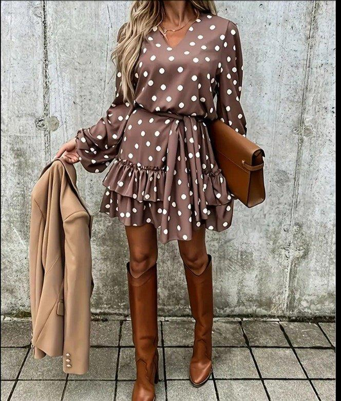 Kadın Uzun Kollu V Yakalı Belden Kuşaklı Puantiyeli Mini Modal Elbise