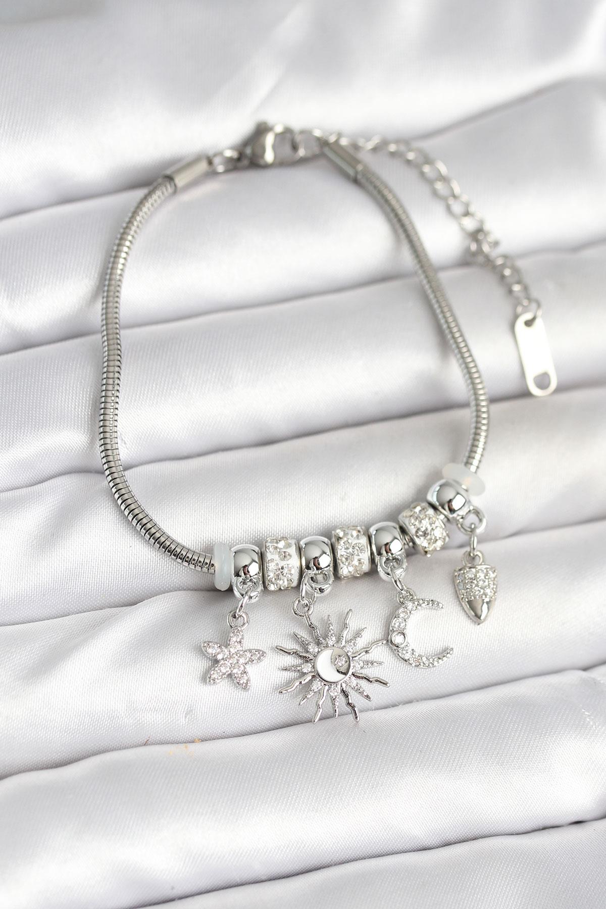 Pirinç Gümüş Renk Ay ve Güneş Charmlı Kadın Bileklik (BB7998)