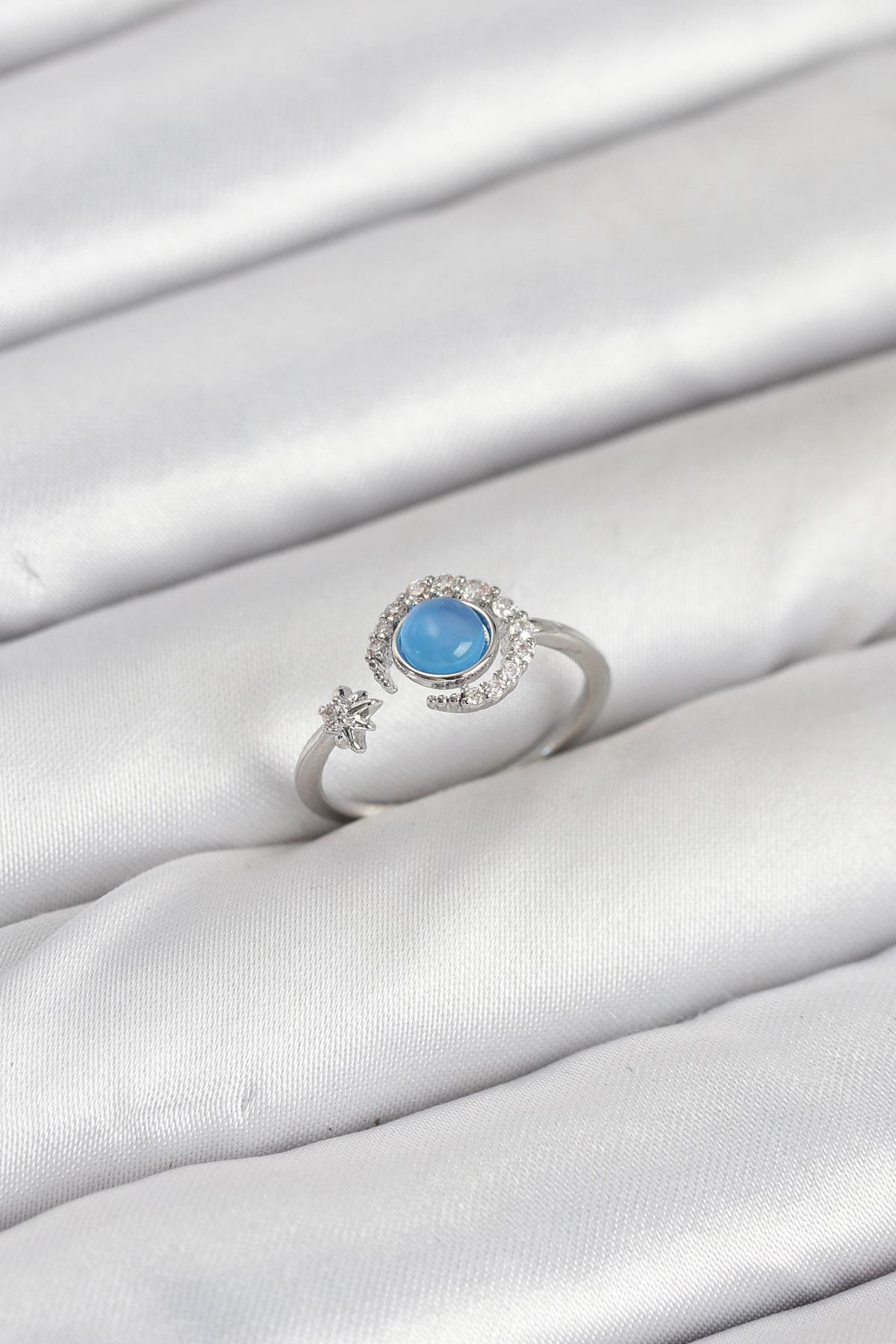Pirinç Gümüş Renk Zirkon Taşlı Ay Yıldız Kadın Yüzük