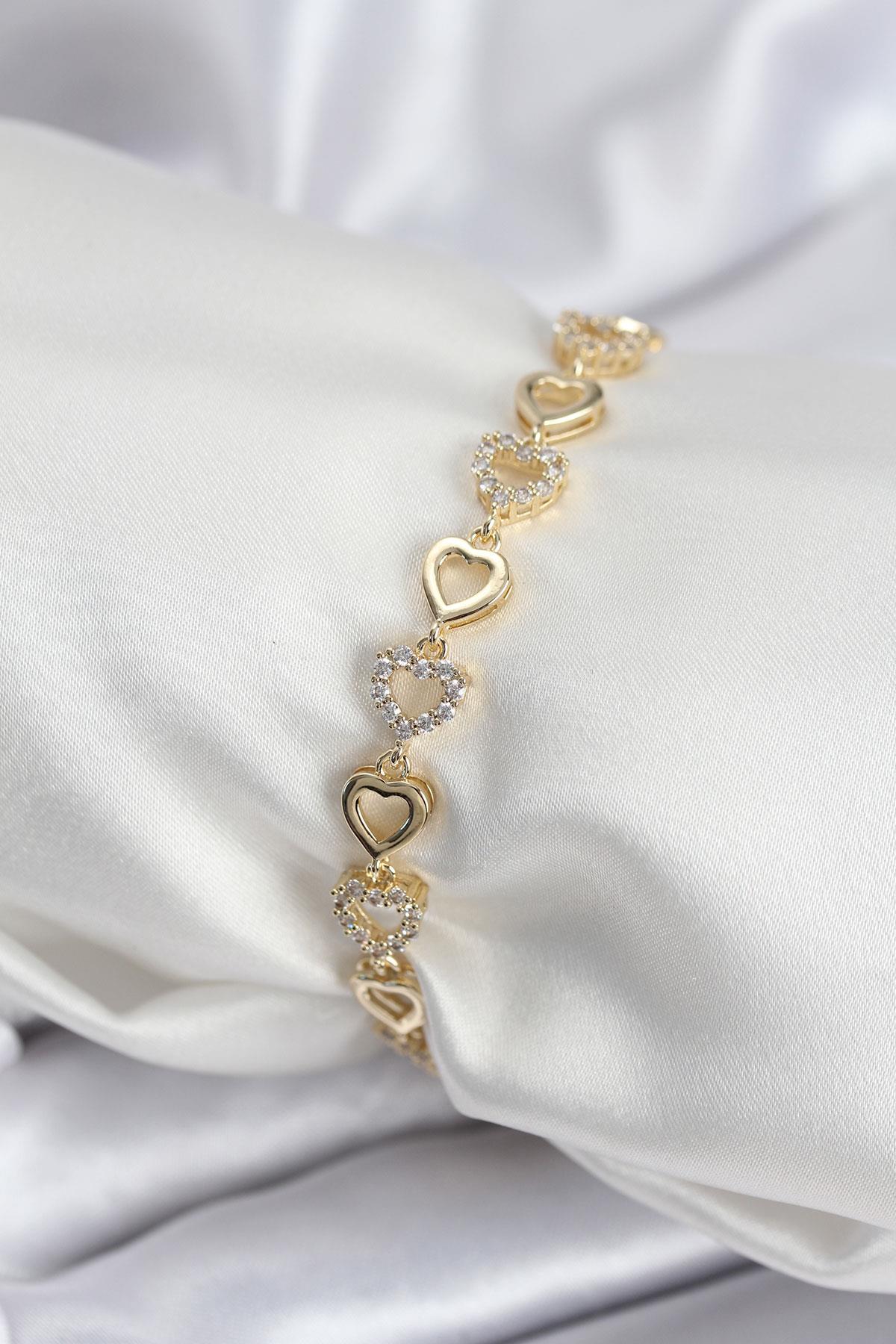 Pirinç VIP Seri Gold Renk Sıralı Kalp Model Kadın Bileklik (BB7935)